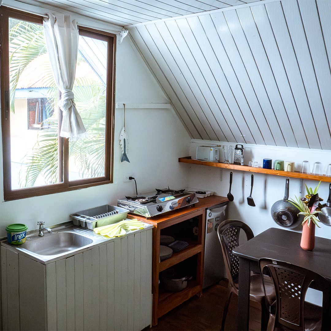 Contamos con 5 casas tropicales de 2 habitaciones, con cocina equipada y baño semi privado. Además, un estudio independiente, una casita privada y un hostel de ambiente relajado.